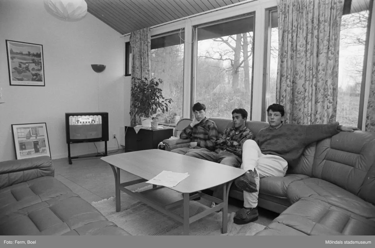 Ett allrum där tre män sitter i en soffa. Dokumentation av Sagåsens flyktingförläggning, 1992.