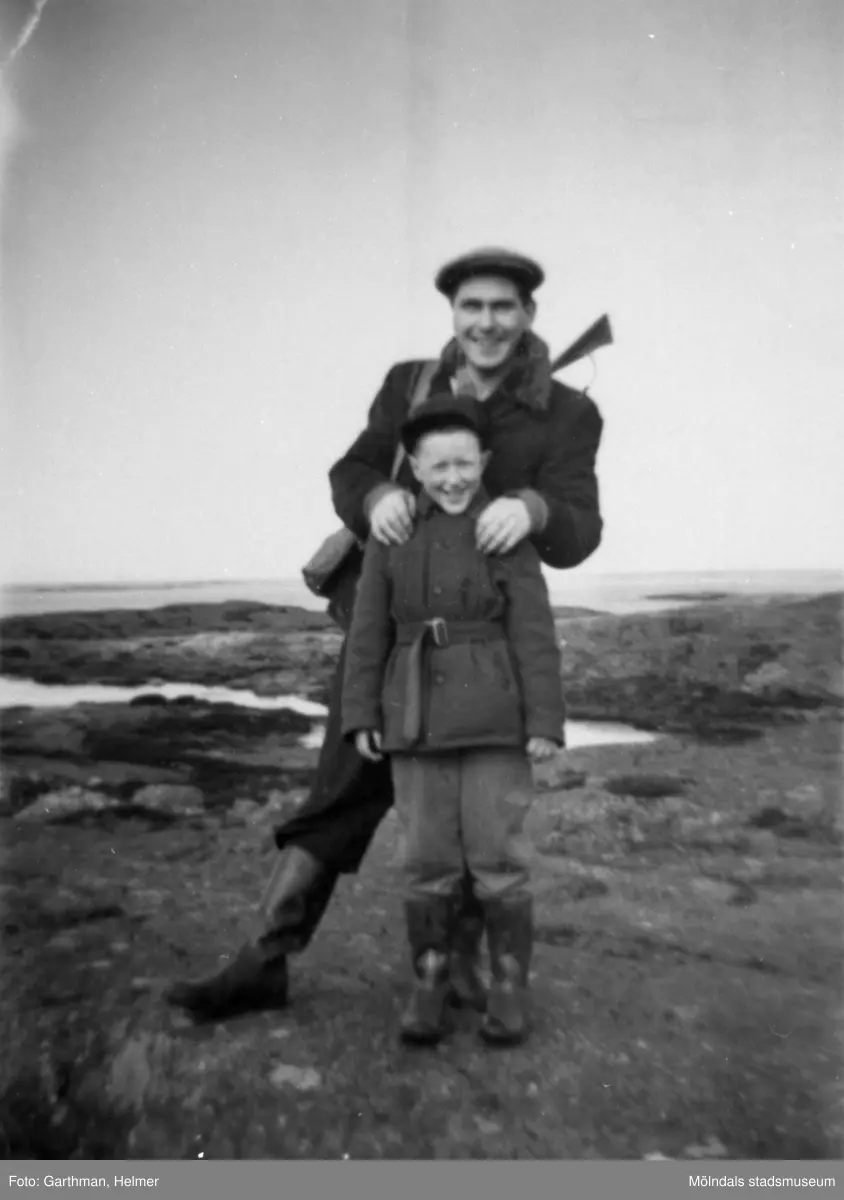 Helmer Garthmans kompis Sven Torgé håller händerna på Leif Garthmans axlar. De poserar ute på Näset, 1950-tal.