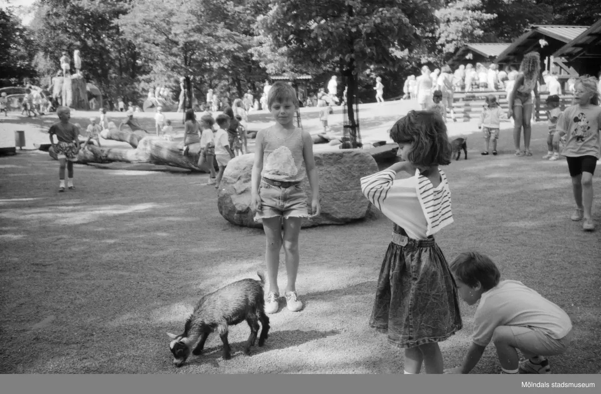 Barnen från Katrinebergs daghem är på utflykt i Slottsskogen. Bredvid dem står en liten killing.