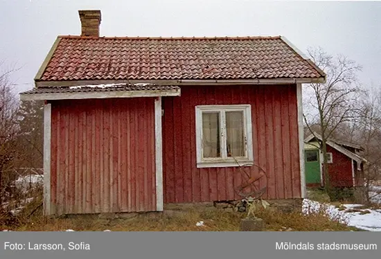 Ett rött uthus på Elof Lindälvs väg 77, Fagered 2:36, Lindome. 2002-01-07.