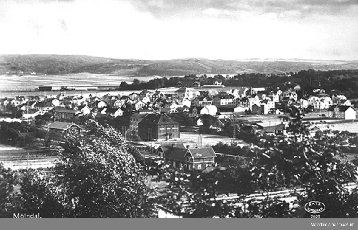 Vy över Mölndalsbro taget från "Trädgården" i sydost. I förgrunden ses Järnvägshuset (järnvägens personalbostad) och ovanför det i bildens mitt ses Svalövsbolaget. Vykort postat 14/9 1931.