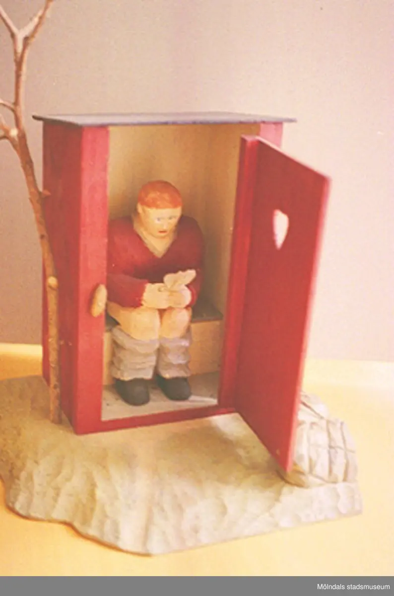 Ett rött utedass med öppen dörr. Därinne sitter en rödhårig person på toaletten och läser i en tidning. Den öppna dörren är försedd med ett hjärta. Utanför står ett litet träd. Harry Bergmans "gubbar" (träfigurer). Liknande foto som 1994_0964.