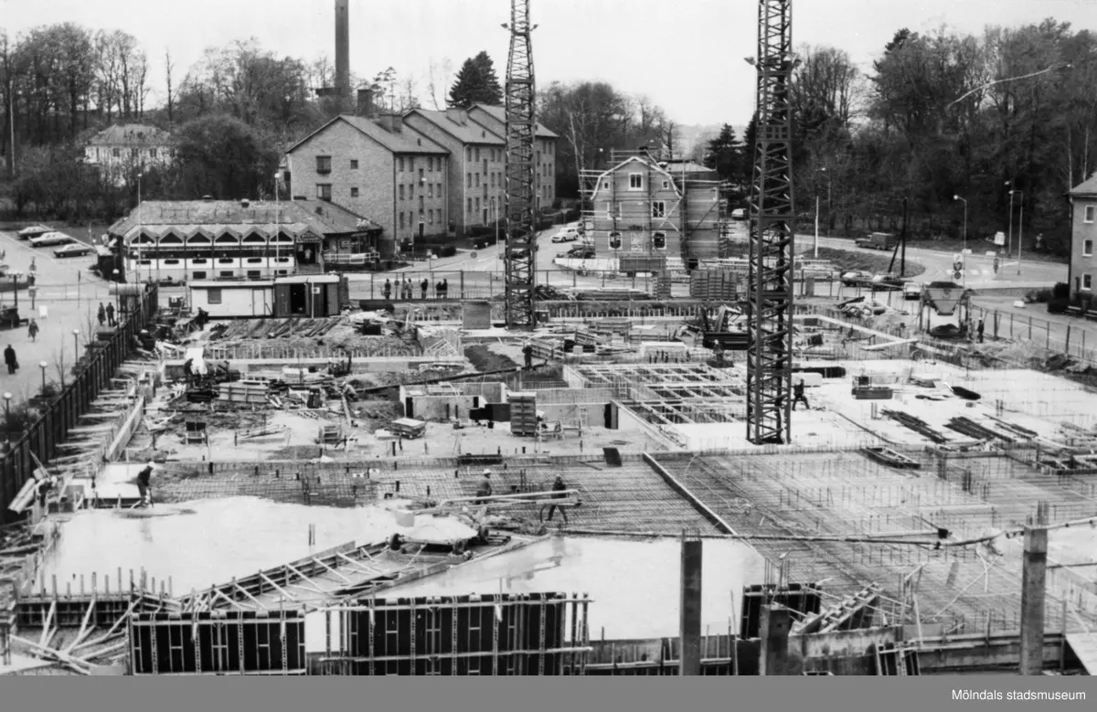 Byggarbetsplats Mölndalsbro-centrum där servicehuset i kvarteret Havskatten håller på att uppföras. Till vänster ses Frölundagatan (nuvarande Storgatan) 23, till höger ligger Joel Jakobssons järnhandel (Joels Järn "Mitt i Rondellen") på Frölundagatan 30, Mölndals Bro 36. Frölundagatan mynnar direkt mot Gunnars Sahlins Terass. Man ser de gula tegelhusen utefter "Kyrkebacken". Längs upp i bildens vänstra hörn ligger möbelhandlare Gustav Zackrissons bostad.