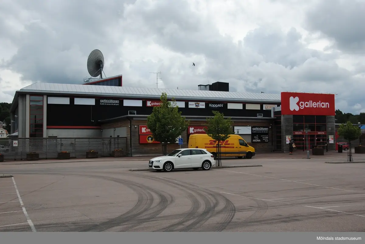 Byggnadsdokumentation av affärscentrum K-gallerian i Kållered med adress Ekenleden 6, Våmmedal 2:158, som fått rivningslov. Exterörfotografi från väster den 5/7 2016.