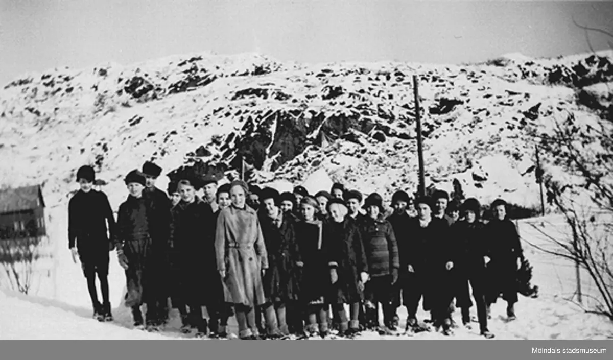 Fjärde året. Lärare: Sven Flodén, Barnen har friluftsdag och står uppställda med spark och kälkar på ängen söder om gamla uppfartsvägen till skolan. Fotot märkt 4a3 på baksidan.