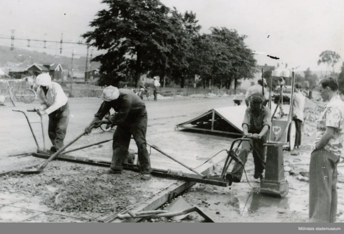 Stensättning av riksvägen vid Lindome station 1948-1949. Fotografiets ägares far var en av arbetarna.