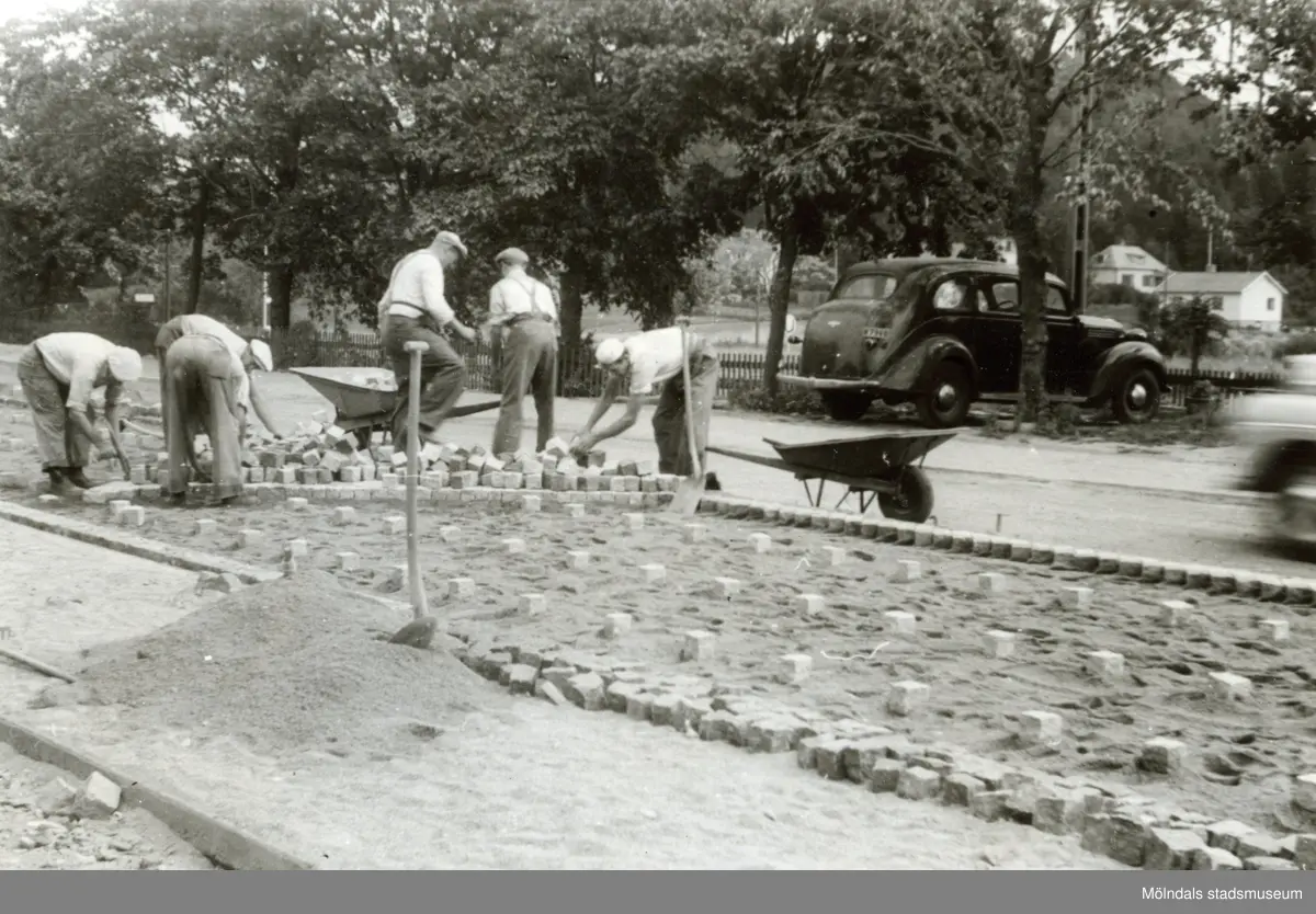 Stensättning av riksvägen vid Lindome station 1948-1949. Fotografiets ägares far var en av arbetarna.