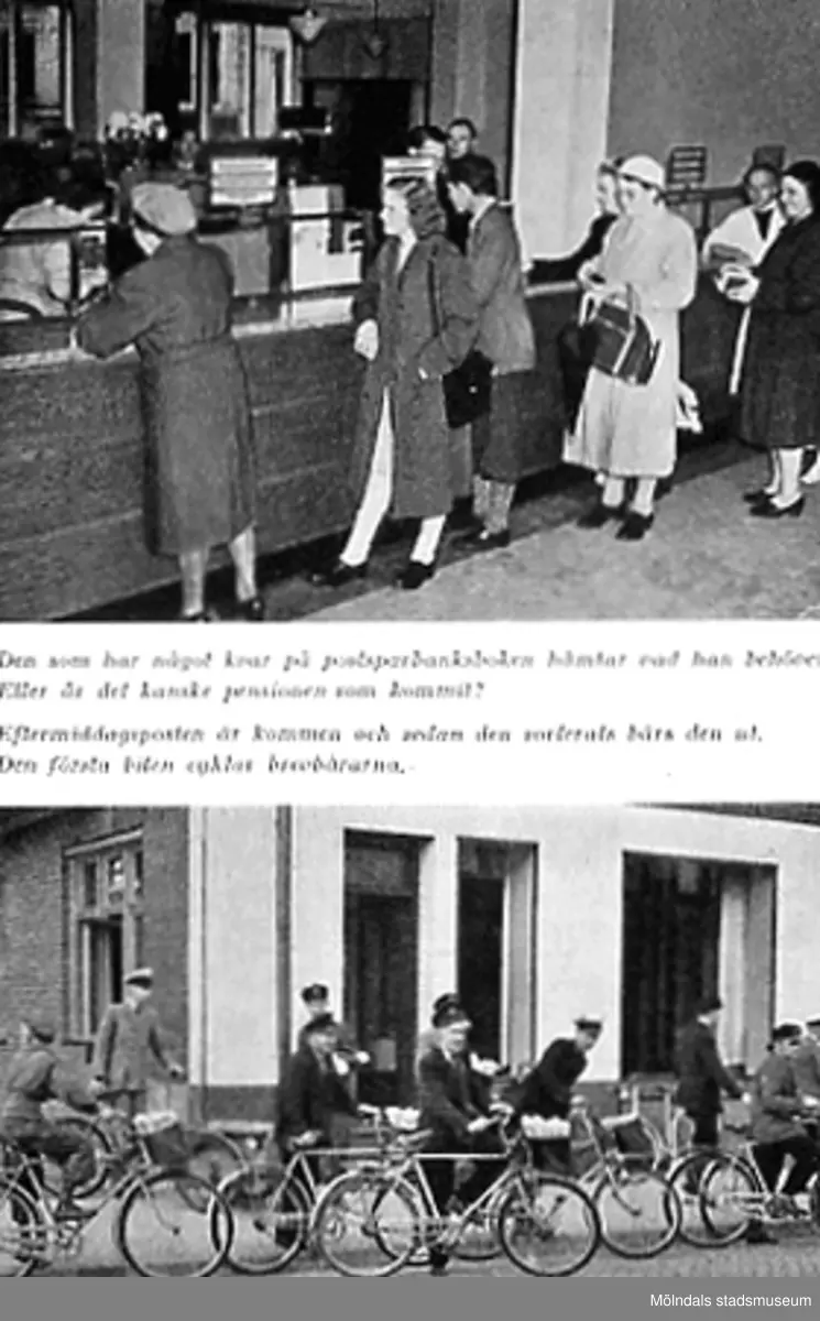 Översta bilden visar människor som köar på Postsparbanken. Den undre visar brevbärare som cyklar ut med posten, okänt årtal. Avfotograferad ur "Mölndal 1922 - 1947".