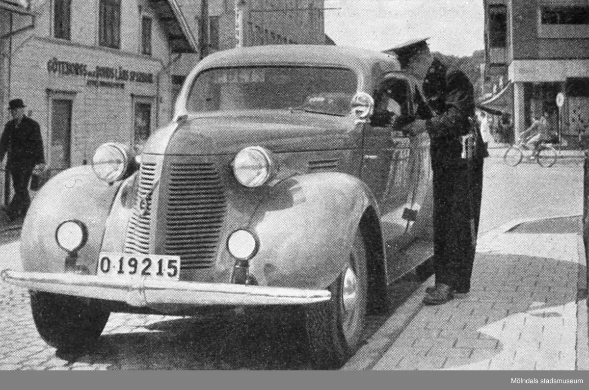 Polisbilen vid Mölndalsbro, 1930-tal. Göteborgs- och Bohusläns sparbank (på Göteborgsvägen) syns i bakgrunden. Avfotograferad ur "Mölndal 1922 - 1947".