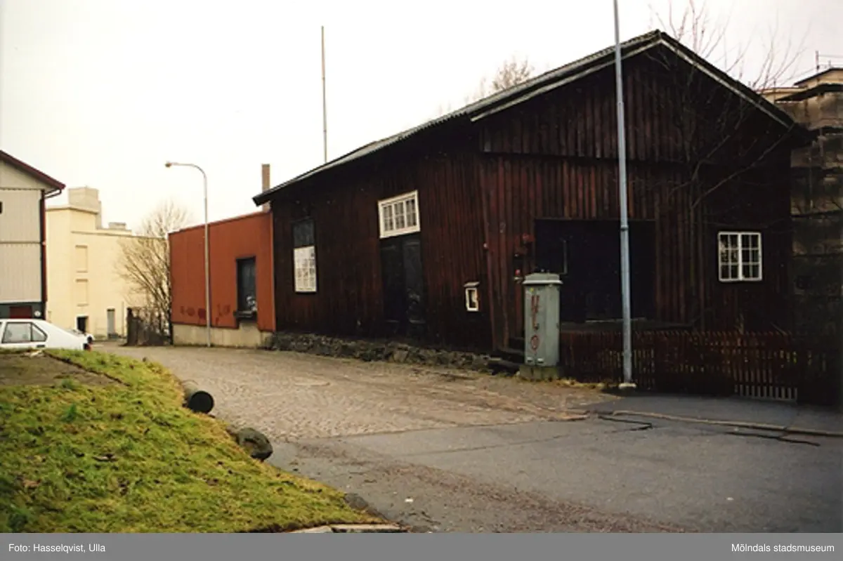 Rivningsdokumentation. Någon form av en ekonomibyggnad på Royens gata 2 (Forsåker 1:255), Mölndals Kvarnby år 2000. I bakgrunden till höger skymtar "Strumpan".
