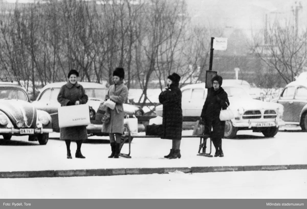 Kvinnor i väntan på spårvagnen i ett vintrigt Mölndal på 1960-talet.