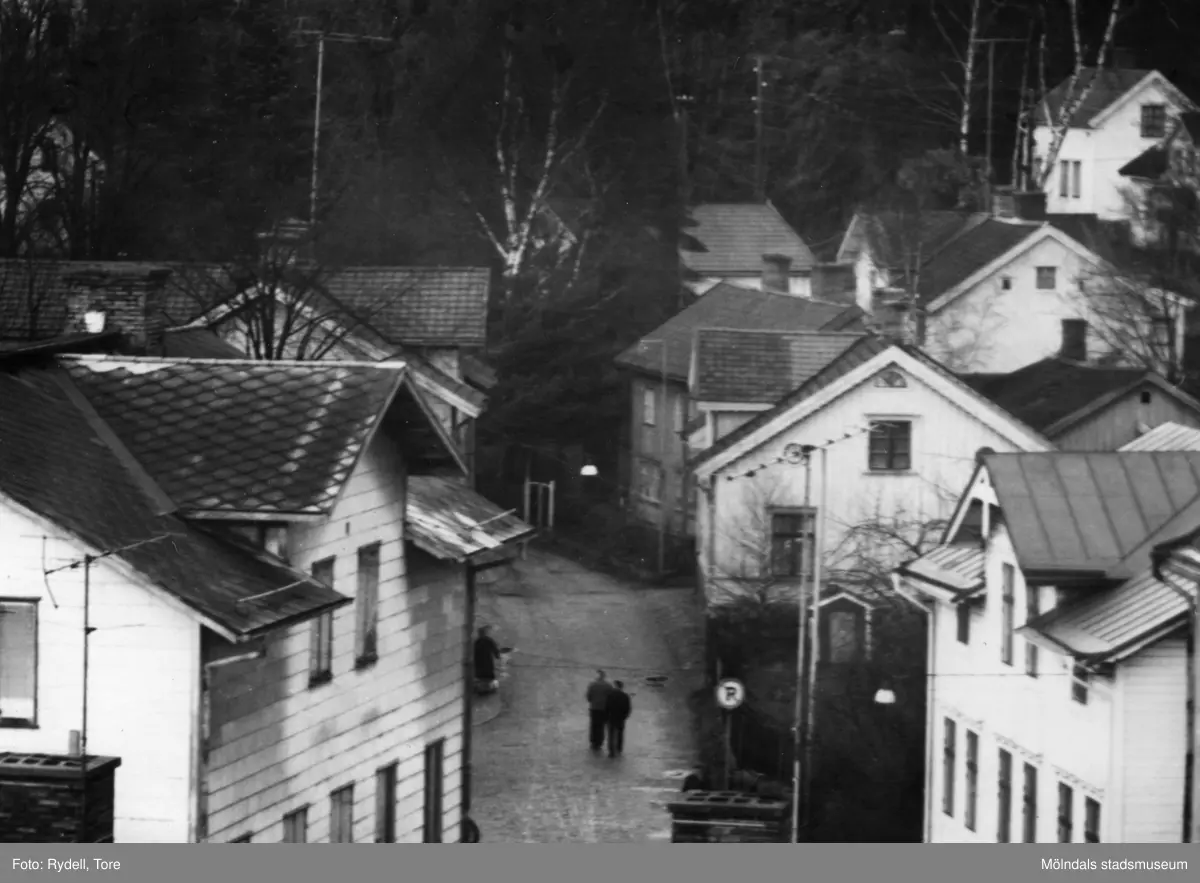 Vy från att av taken på pappersbruket Papyrus industribyggnader mot bebyggelse på Trädgårdsgatan i Trädgården, Mölndal, på 1960-talet. Huset till vänster har nummer 3.