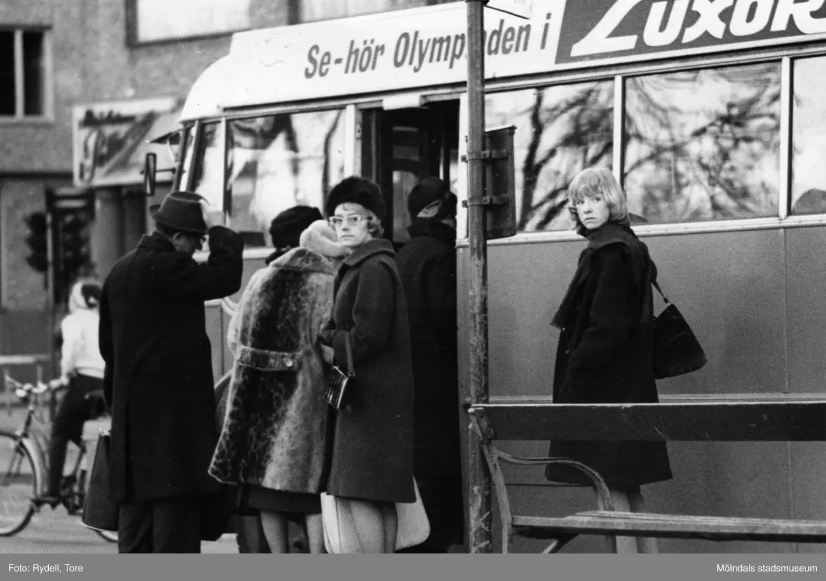 "Tag plats." En samling bussresenärer kliver på bussen vid Göteborgsvägen i Mölndalsbro någon gång på 1960-talet.