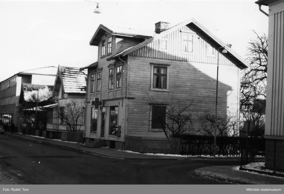 Bebyggelse på Frölundagatan i Mölndalbro, Mölndal, en vinterdag på 1960-talet.