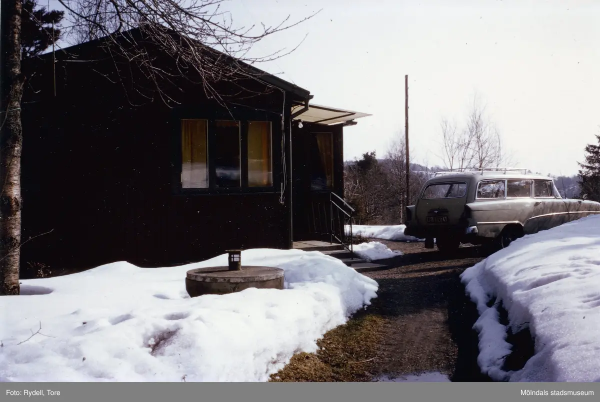 Ett bostadshus och en parkerad bil i Mölndal en vinterdag på 1970-talet.