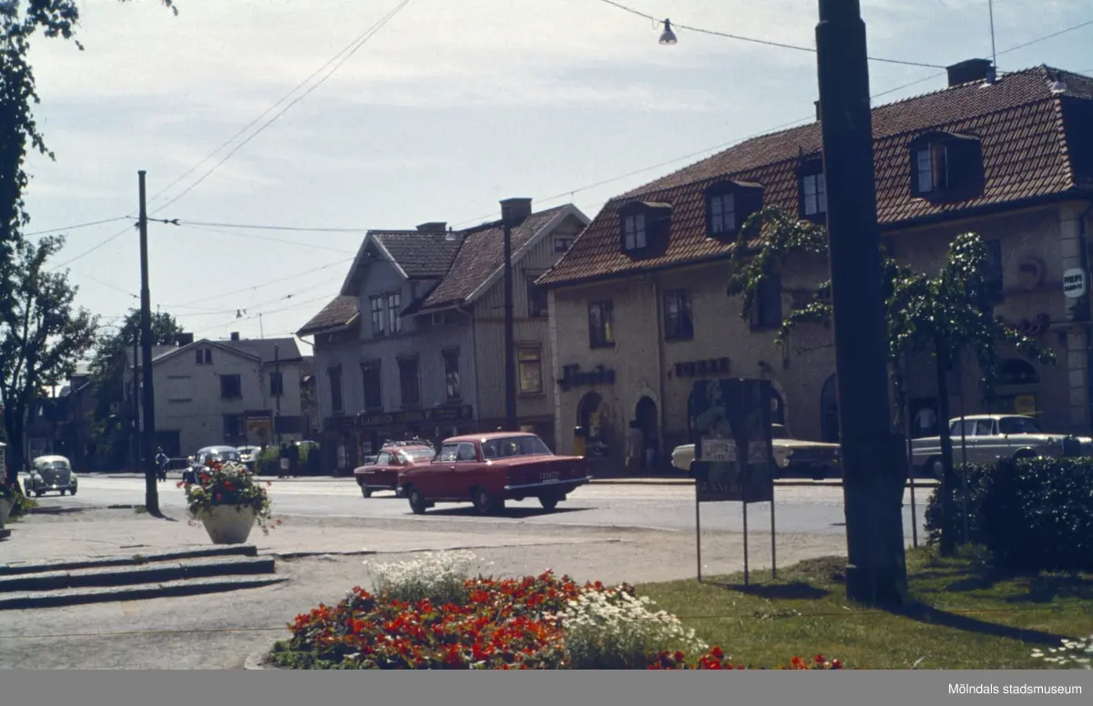 Vy från Kungsbackavägen i Mölndals centrum på 1960-talet. Huset i mitten är E. & K. Karlssons järnhandel.