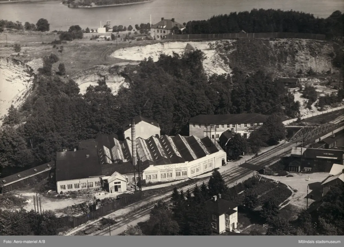 Inramat flygfoto över Forsåkers fabriker vid Grevedämmet i Mölndal. I bakgrunden ses Stensjön och Stensjöhill. Fabriksbyggnaden kallades tidigare för Bettyholm och Carlsfors fabriker. Relaterat motiv: 2012_0171.