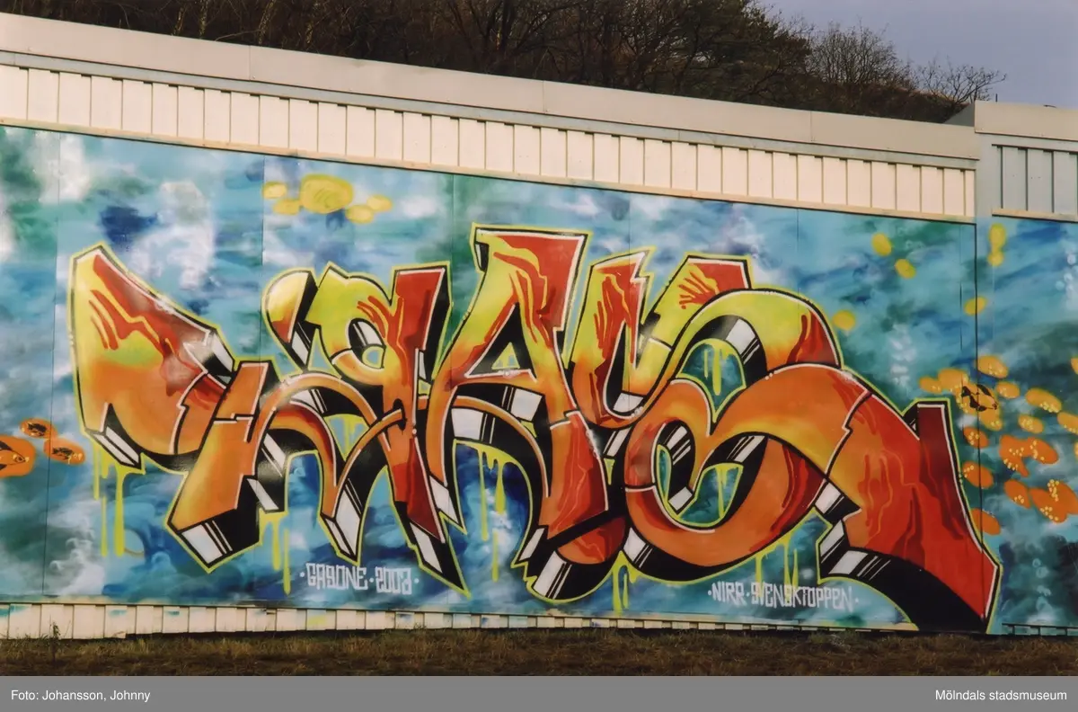 Titel: Graffiti längs Kvarnbygatan i Mölndal, år 2003.