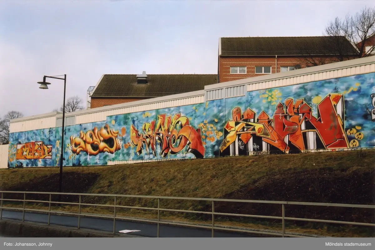 Titel: Graffiti längs Kvarnbygatan i Mölndal, år 2003.