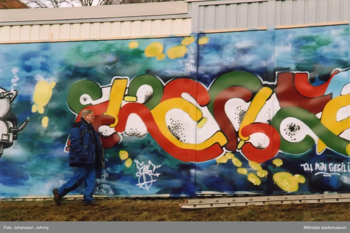 Graffiti längs Kvarnbygatan i Mölndal, år 2003.