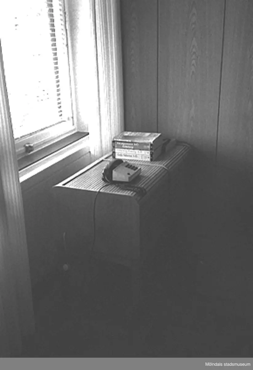 Mölndals stadshus, juni 1994. Ett bord med en telefon och telefonkataloger på.