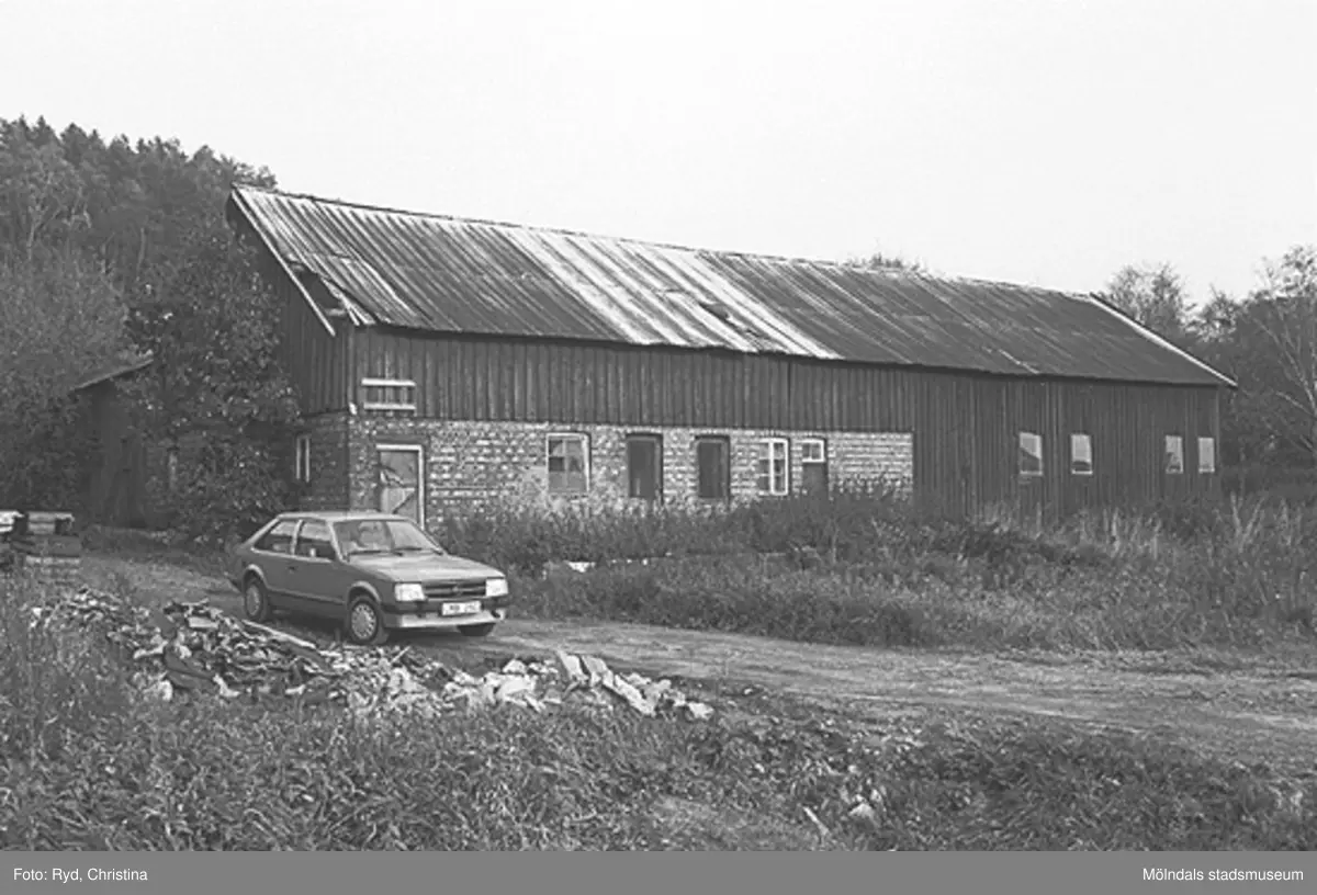 Ladugård vid Toltorpsgatan 9, mitt emot kiosk. Det står en bil parkerad utanför ladugården. Bilden är tagen under 1990-talet.