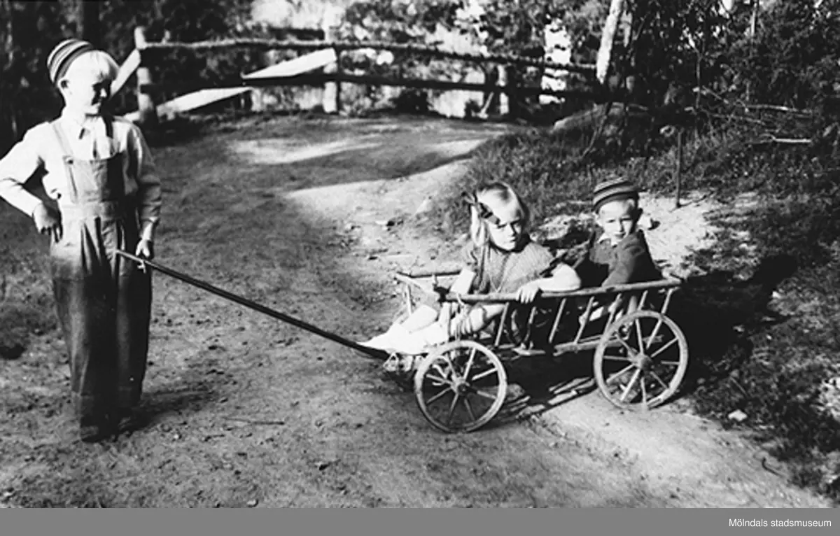 Eva Pettersson (gift Kempe) åker skrinda tillsammans med Christer Andersson i Torrekulla 1948. Göran Andersson drar skrindan. Barnen är lekkamrater och grannar.