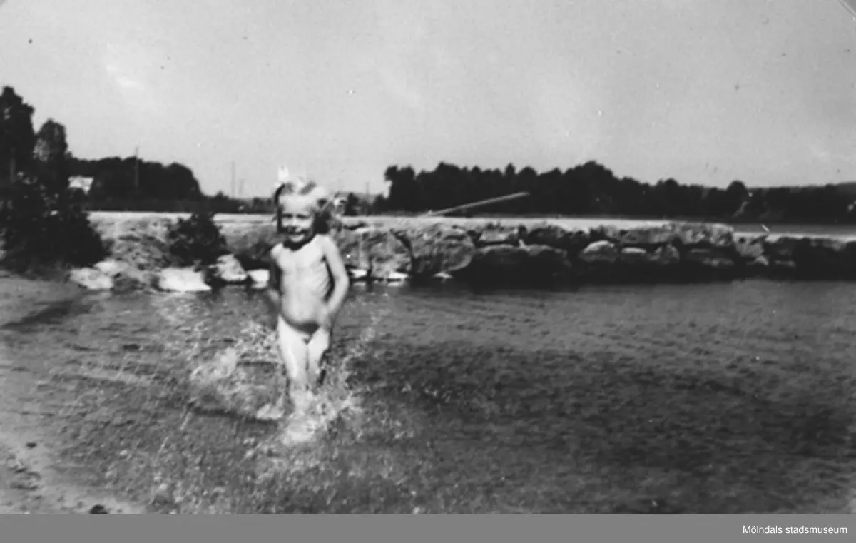 Eva Pettersson (gift Kempe) badar och leker i Tulebosjön vid Stretered, år 1947.