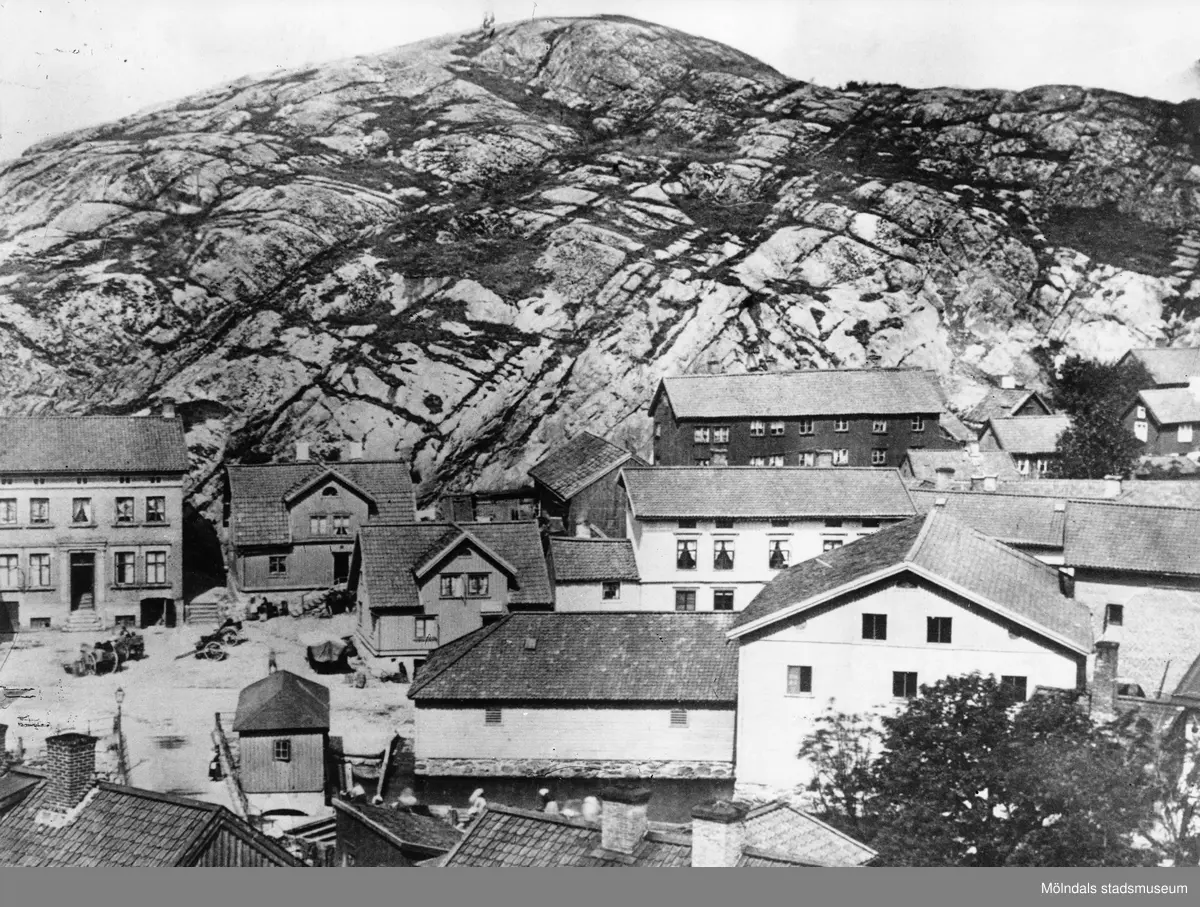Gamla Torget i Mölndals Kvarnby före år 1900. I bakgrunden ses Störtfjället. I bakgrunden till höger ses gamla Skraltorp, Roten F 6.