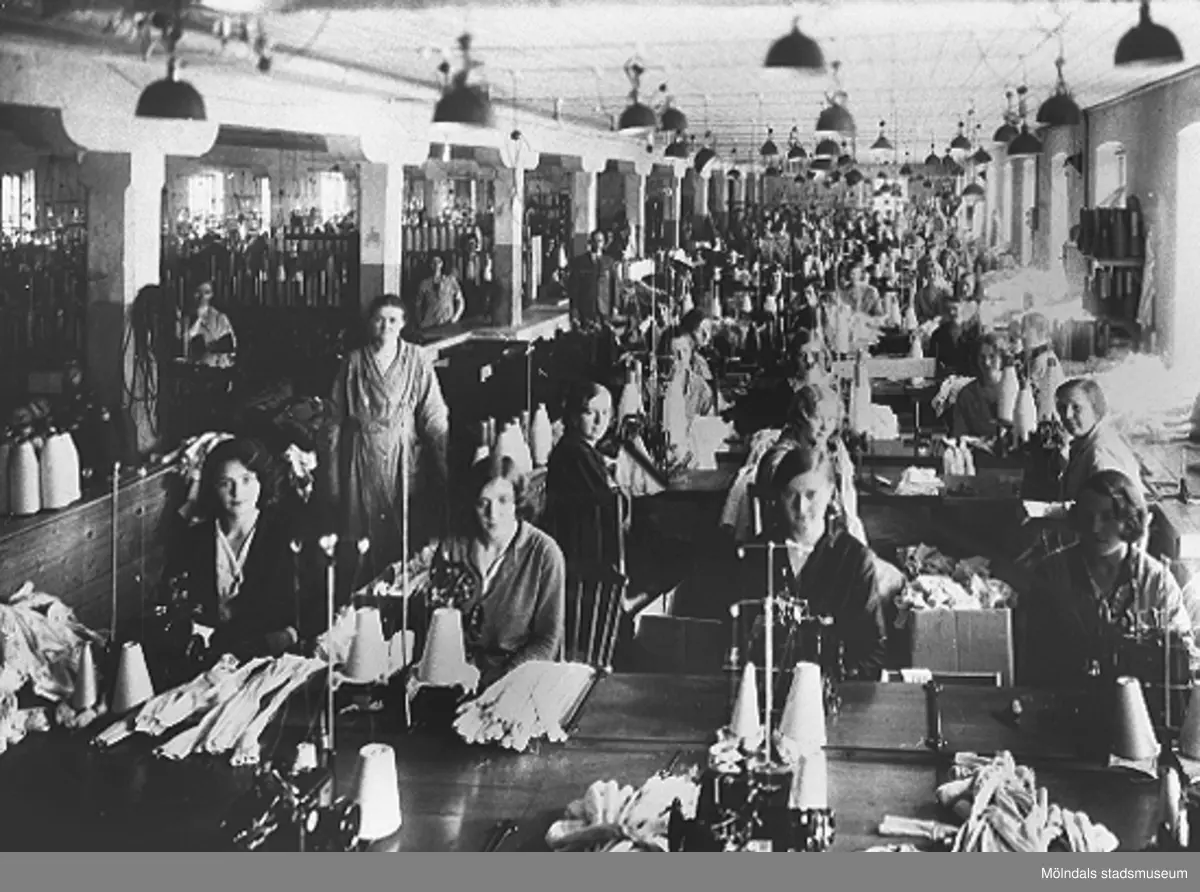 Kvinnlig personal arbetar i Viktor Samuelssons fabrik, strumpfabriken "Strumpan", 1930-tal.