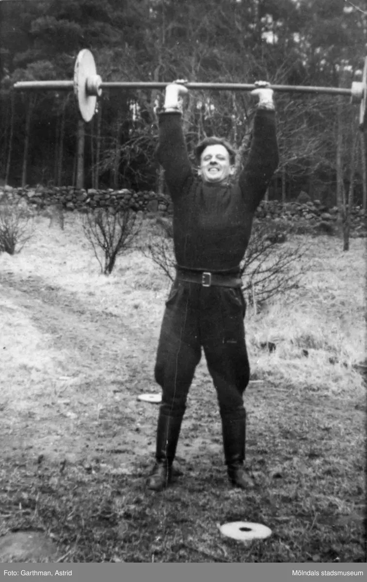 Givarens far Helmer Garthman, iklädd ridbyxor, står utomhus lyftandes en skivstång. Krokslätt, 1940-tal.