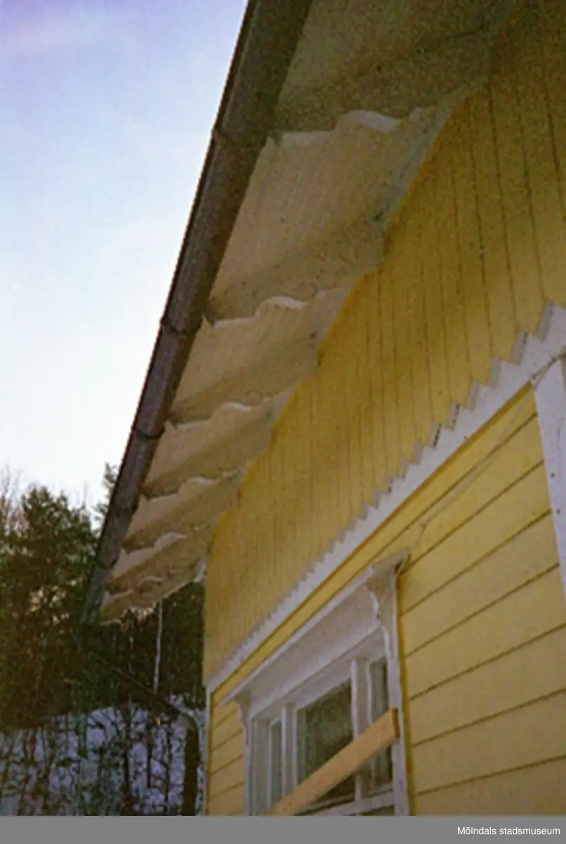 Villa Solbacken i Krokslätt, januari 1995. Fasad på bostadshuset som ligger väster om Krokslätts fabriker. Byggnadsdetaljer: Takränna och fönster. Relaterade motiv: 1995_0759 - 0782.