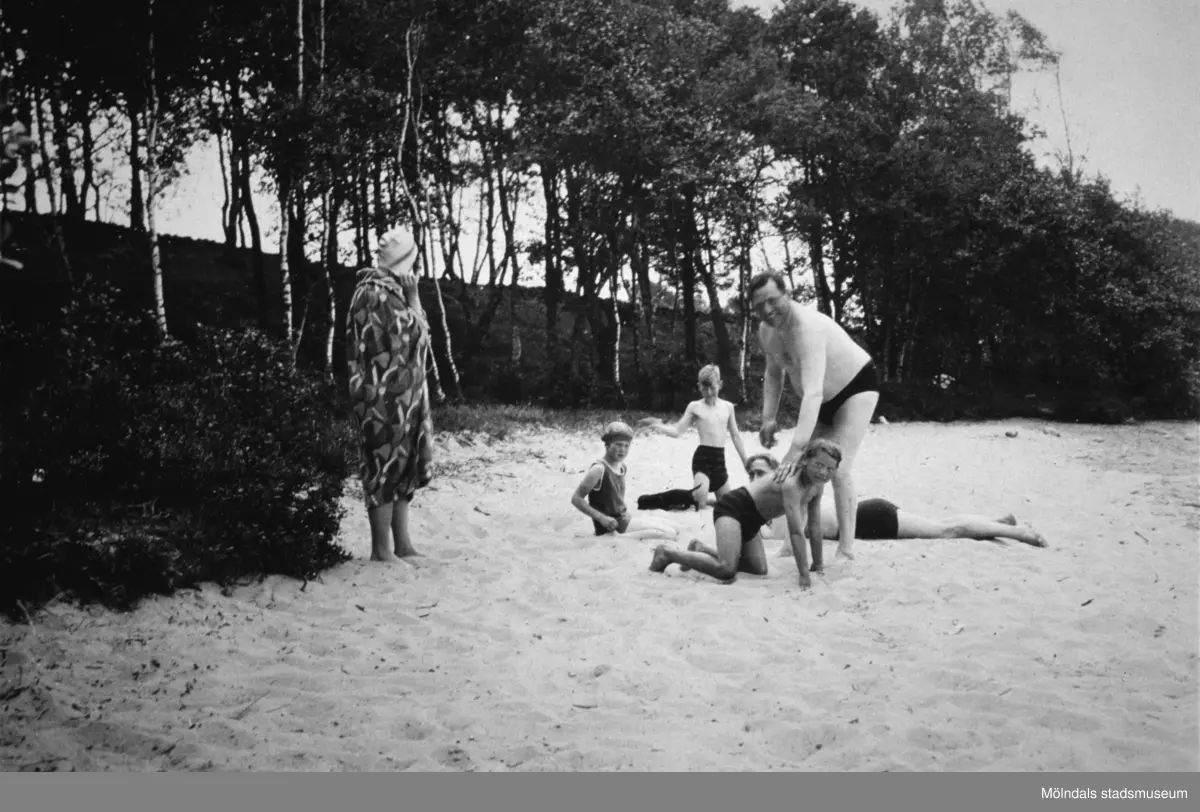 Två män, en kvinna och tre barn på en sandstrand, troligtvis vid Tulebosjön, 1930-tal.