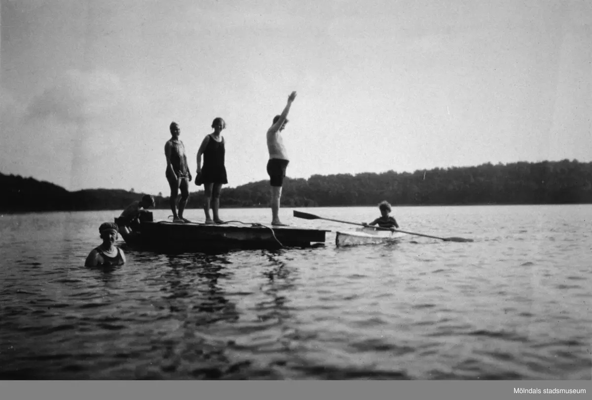 Män och kvinnor på en flotte samt en person i en kajak, troligtvis vid Tulebosjön 1930-tal.