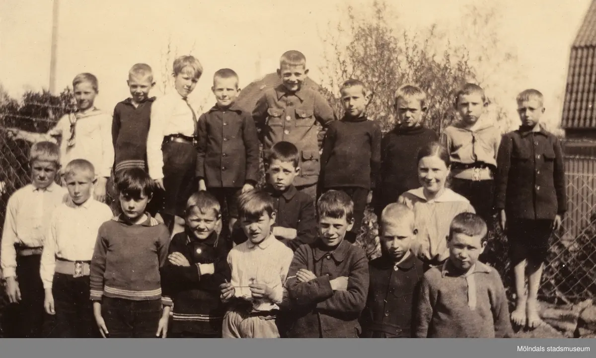 Gruppfoto av skolklass. Övre raden, femte personen fr.v.: Karl-Erik Marmgren. Direktören Martin Holterman i Ostindiska kompaniet ägde Åby gård. 1782 skänkte han 3000 daler silvermynt till Fässbergs församling + ett nybyggt skolhus och trädgård på gårdens ägor vid Åby by. I skolan skulle 10 fattiga barn undervisas i "kristendom, skrivande och något räknande. Holtermans skola fanns kvar till 1875. Då hade donationens ändamål ändrats, och man byggde i stället ett barnhem kombinerat med småskola. 1914 brann barnhemmet och 1915 byggdes ett nytt barnhem på samma tomt. 1929 överlämnades barnhemmet till Mölndals stad.