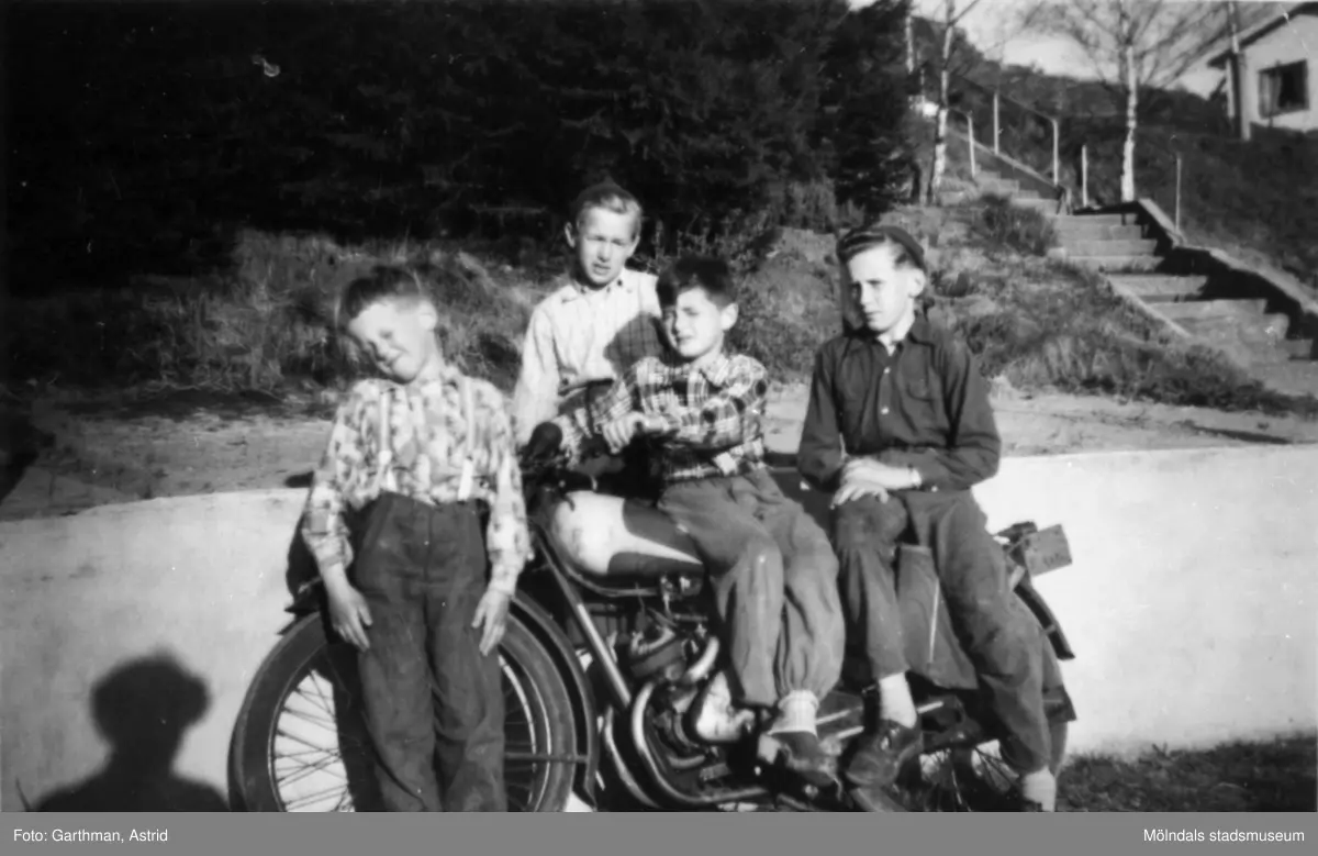 Fyra pojkar, okända för givaren, sitter/står runt en Rex Willers motorcykel i Mölndal. 1950-tal.