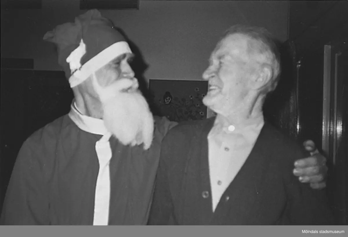 En jultomte kramar om en manlig boende. Mannen ler. Okänt årtal.