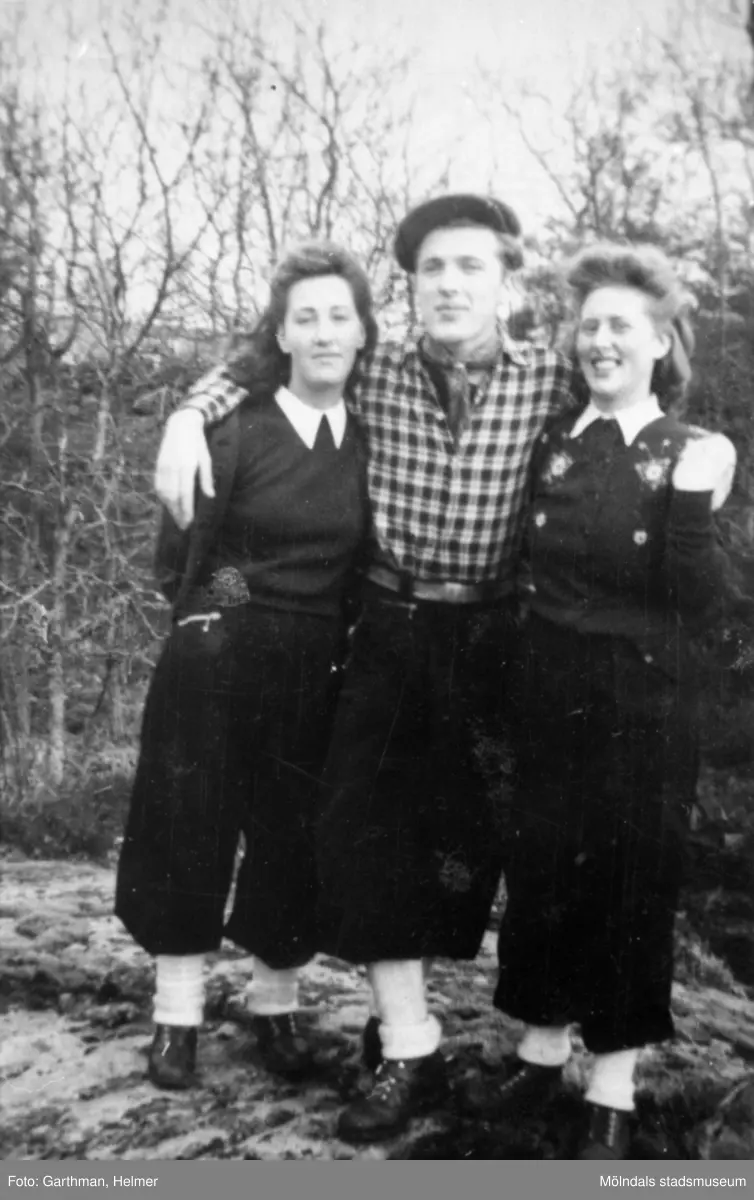 Charlie Jinnestedt håller om Elsa Jinnestedt till vänster och Astrid Garthman till höger. Fjärås Bräcka, 1940.
