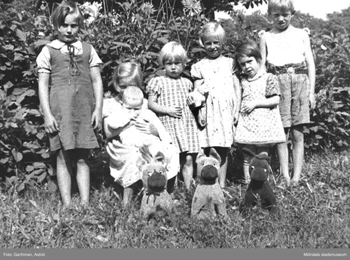 Barn boende vid Kvarnfallet 31, 1930. De står på en grässluttning framför några träd. Det är bland annat givarens mostrar och fastrar samt grannar till dem.