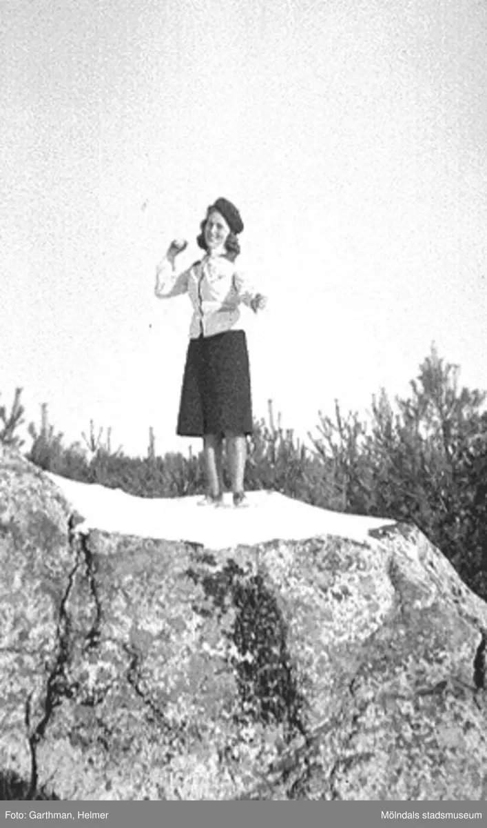 Astrid Garthman, snyggt klädd i hatt, kofta och kjol, står på en klippa och siktar mot fotografen för att kasta en snöboll. Mölndal, 1940-tal.