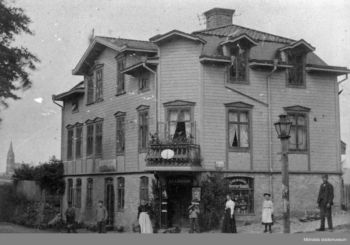 Till höger om dörren står "moster" Lovisa Johnsson. Längst till höger John Johansson, privatchaufför hos Papyrus disponent. I våningen med balkong bodde fru Tisell som hade telegraf-och telefonstation i huset.