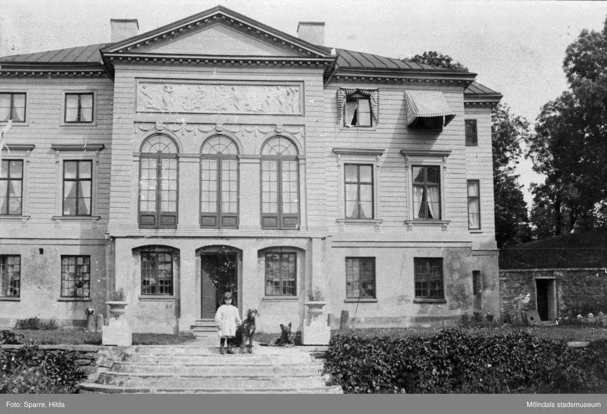 Gunnebo slott i Mölndal. Södra sidan. På trappan står en flicka med två hundar. Fotograf Hilda Sparre? År 1894?
