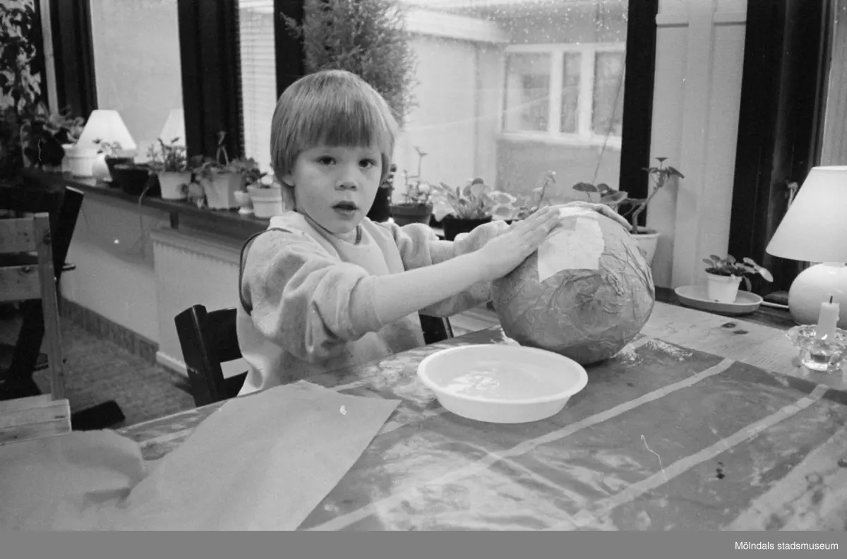 En pojke sitter vid ett bord, inomhus på Katrinebergs daghem, och limmar silkespapper på en uppblåst ballong. Limmet ligger på en plasttallrik framför honom och han tittar mot kameran.