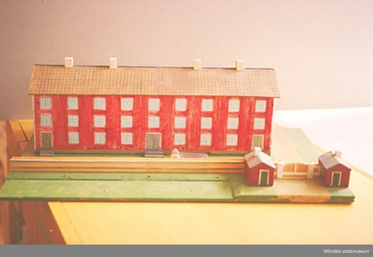 Ett rött bostadshus med tio fönster i rad, tre våningar högt, och tre entréer. På taket finns fyra skorstenar. Vid sidan av ligger två mindre stugor. Huset är en kopia av "Byggninga" som var arbetarbostäder till Anderstorps fabriker i Lindome. Se även 1994_0993. Harry Bergmans "gubbar" (träfigurer).