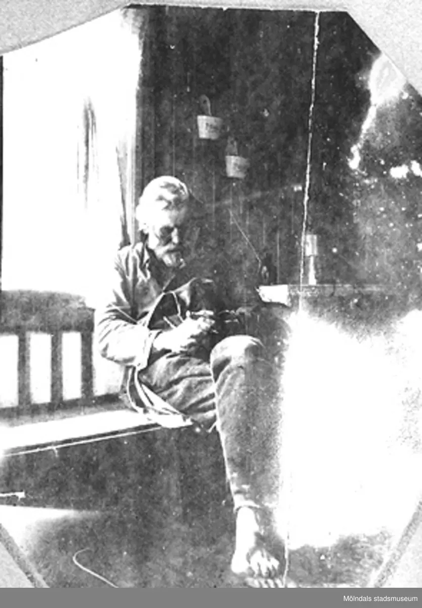 Långe-August, född 1855 i Kållered. Han var dräng bl a hos Maria och Josefin Eriksson på Vommedal Östergård. Cirka 1900-tal.