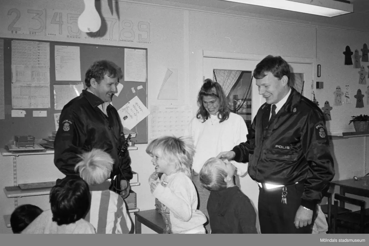 Linda Olausson och dagisbarnen har besök utav två polismän inne på Hoppetossan, Katrinebergs daghem, 1992-93.