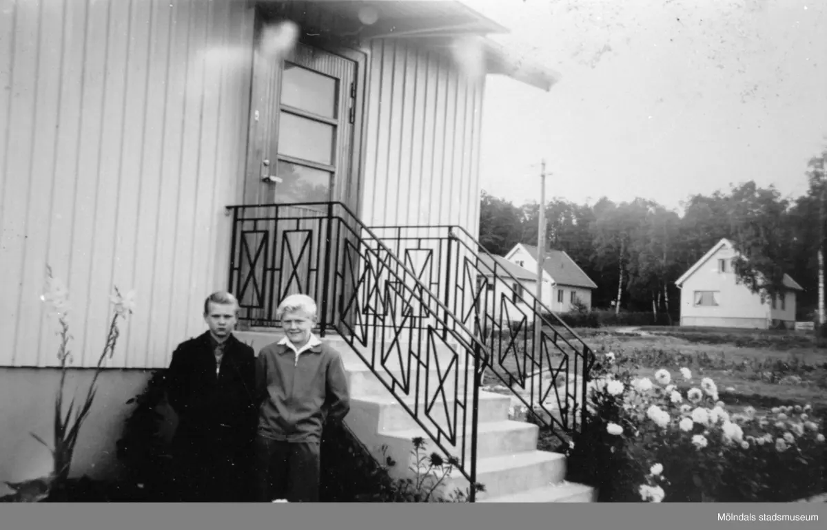 Pojkarna Ilmar Kaljurand och Ilmar Karisaar står utanför hustrappan till Gödebergs egnahemsområde omkr 1955-60. Huset i förgrunden är byggt 1953-54 och husen i bakgrunden är byggda 1948.