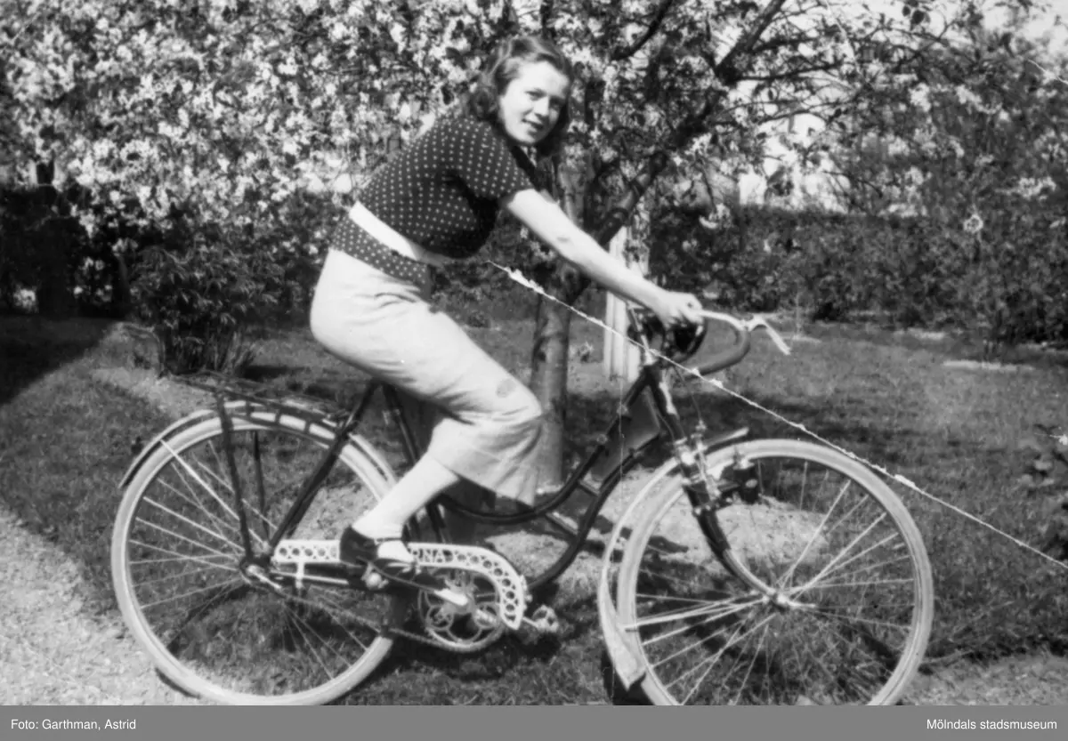 En ung kvinna som sitter på en damcykel, 1930-tal. Kamrat till fotografen Astrid Garthman. Skänkt av sonen Alf Garthman som arbetade under många år på Mölndals stadsmuseum.