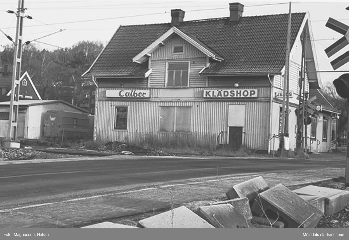 Kållereds stationshus på Gamla riksvägen i Kållered centrum. När fotot togs så låg den mycket populära jeansaffären "Caiber klädshop" i byggnaden. Ungdomar "vallfärdade" dit pga butikens moderna jeans med lägre priser.