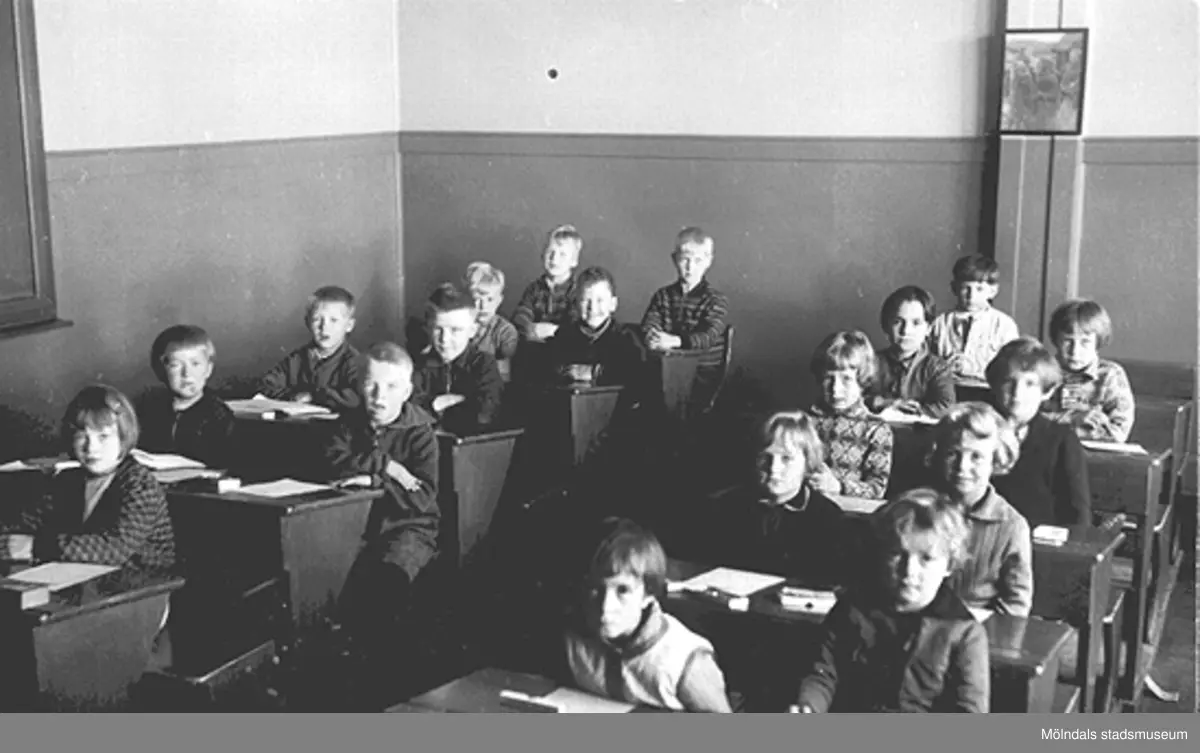 På kortets baksida står, från vänster framifrån, bänk för bänk, vänstra bänkraden: "1 året Ingeborg Andersson, Ingemar Ekström, Karl Andersson (?), Rune Nilsson, Leif Holm, Rune Olsson, Jean Brandin, Karl-Erik Bergström-(Lindström), Allan Hultgren"; högra bänkraden: "Nora Björklund, Mabrel ?, Ulla Segerholm, Kate Andersén, Ulla Holm?, Kerstin Andersson